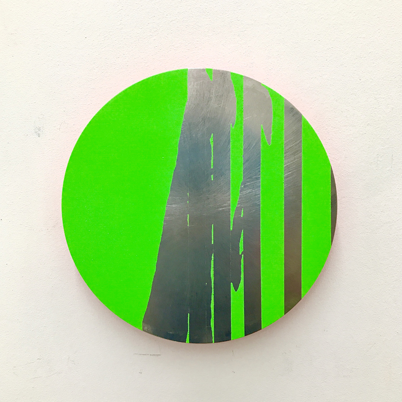 Organic and vertical lines of Green on Metal with Red on the back, 2017